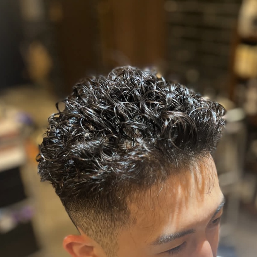 サイドやバックを短く刈り上げることで清涼感を残しつつ、トップにパーマで動きをプラス。