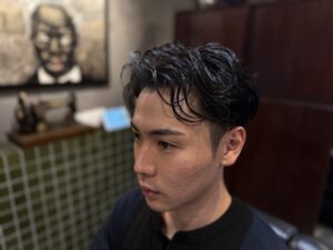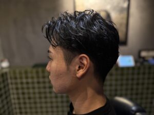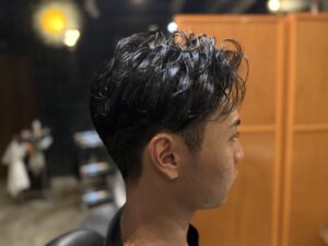 フェードもあえて3mmで施し、もみあげとネックラインを強調させる事でいま風になります!